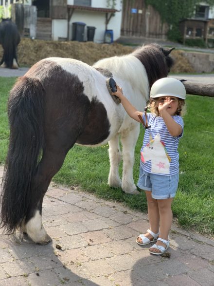 Unter der Woche bieten wir geführtes Reiten für Ihre Kinder an – bitte bringt einen eigenen Helm dafür mit.