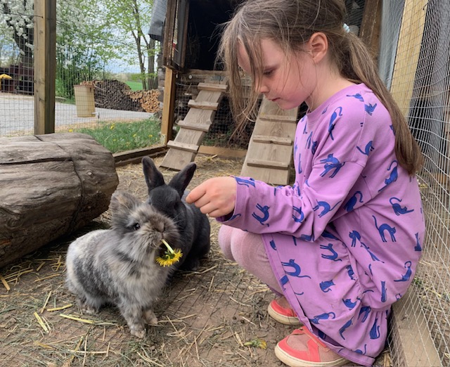 Nala, Molly, Pia und Fleckchen, unsere Häschen genießen das Faulenzen und freuen sich wenn sie von den Kindern mit frischem Gras oder Löwenzahn verwöhnt werden.